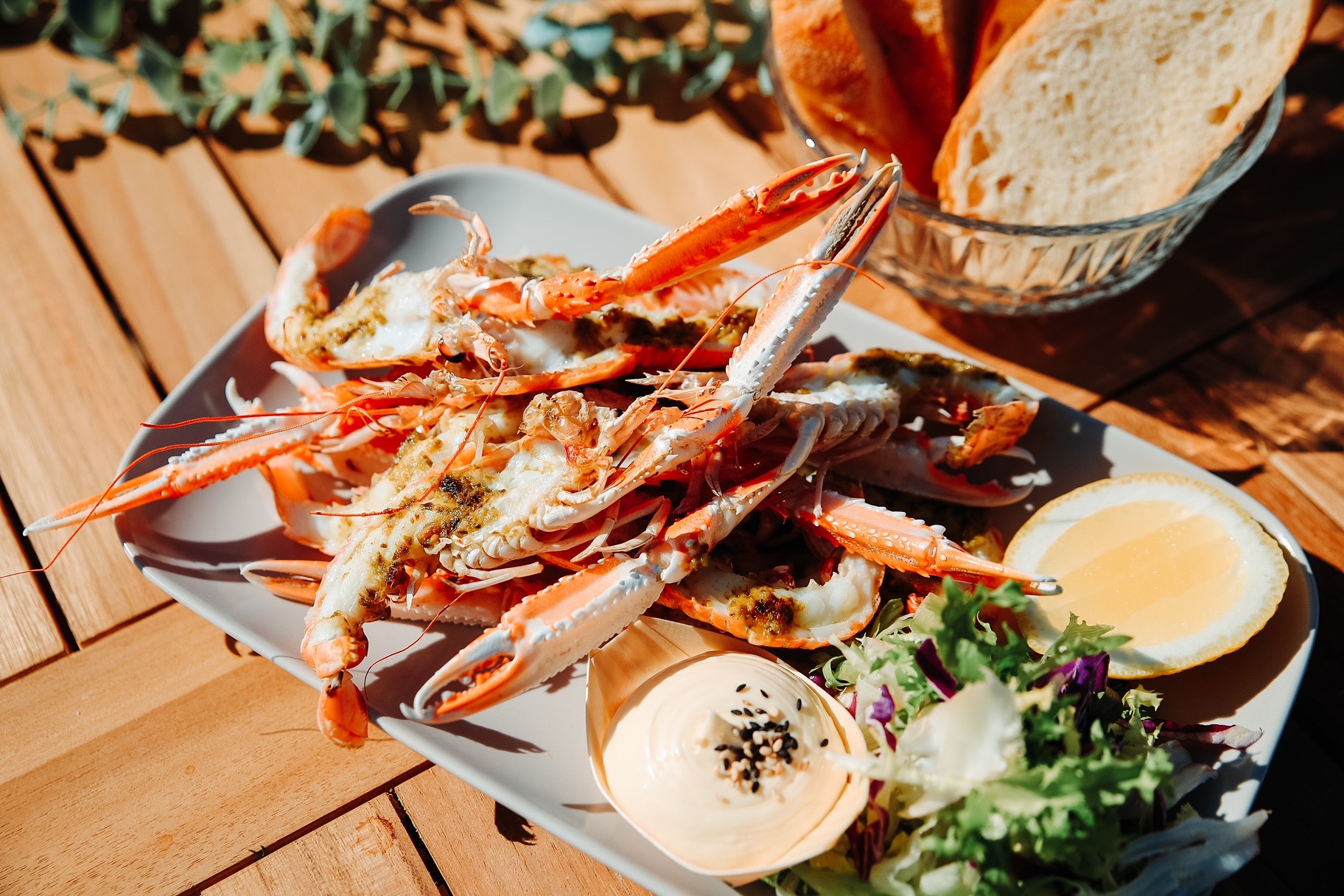 Bagte jomfruhummere vendt i pesto og parmasan, serveret med friskbagt baguette, salat, aioli & citron